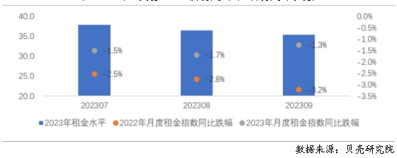 图6 2023年三季度重点40城月度租金水平及月度租金指数变化