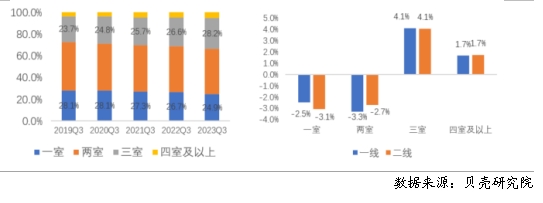 大户型占比增加趋势显著,三居室成交占比首次超过一居室