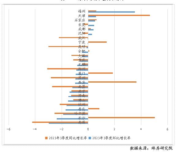 住房大数据监测的26个二线城市中,仅有6个城市的住房租金环比上涨,20个城市的住房租金环比下跌。其中,南通和长沙降幅最高,分别为2.97%和2.36%,其余城市降幅均不超过2%;福州涨幅最高为3.53%,其余城市涨幅均不超过1%。与2022年三季度末相比,住房大数据监测的26个二线城市中有16个城市住房租金同比下降,10个城市住房租金同比上涨。其中,南通、郑州、昆明等城市住房租金同比跌幅最大,分别下跌4.23%、3.09%和3%;长沙、天津、西安等城市住房租金同比涨幅最大,分别上涨5.03%、4.66%和3.65%。