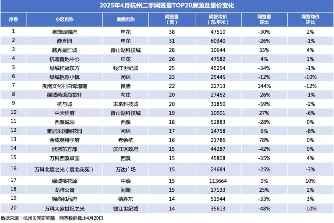 从4月成交前20的小区来看,申花依旧是热度最高的板块。其中星瓒颂锦府成交量继续保持杭州第一,共网签38套(4月数据为中介端成交,不含自主交易,下同),环比下滑了30%;其次是申花另一个次新房馥香园,4月网签了31套;还有杭曜置地中心,网签了26套。