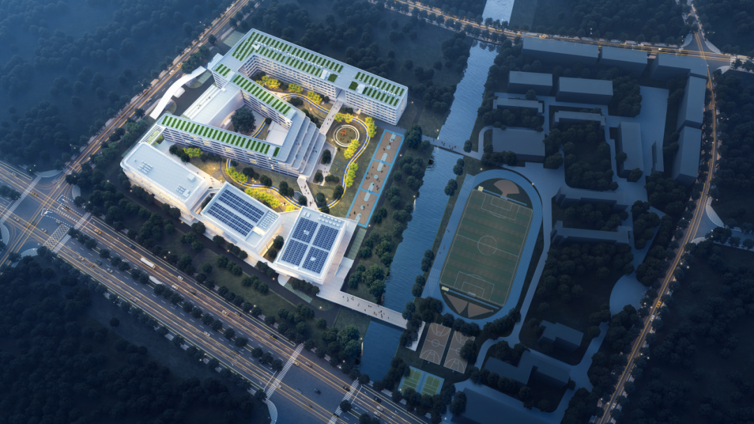项目采用“两轴多庭院”的总图空间结构布局,精心打造“可观、可思、可学、可游”的四大核心场景,旨在构建一所适配当地高中教育的未来校园。