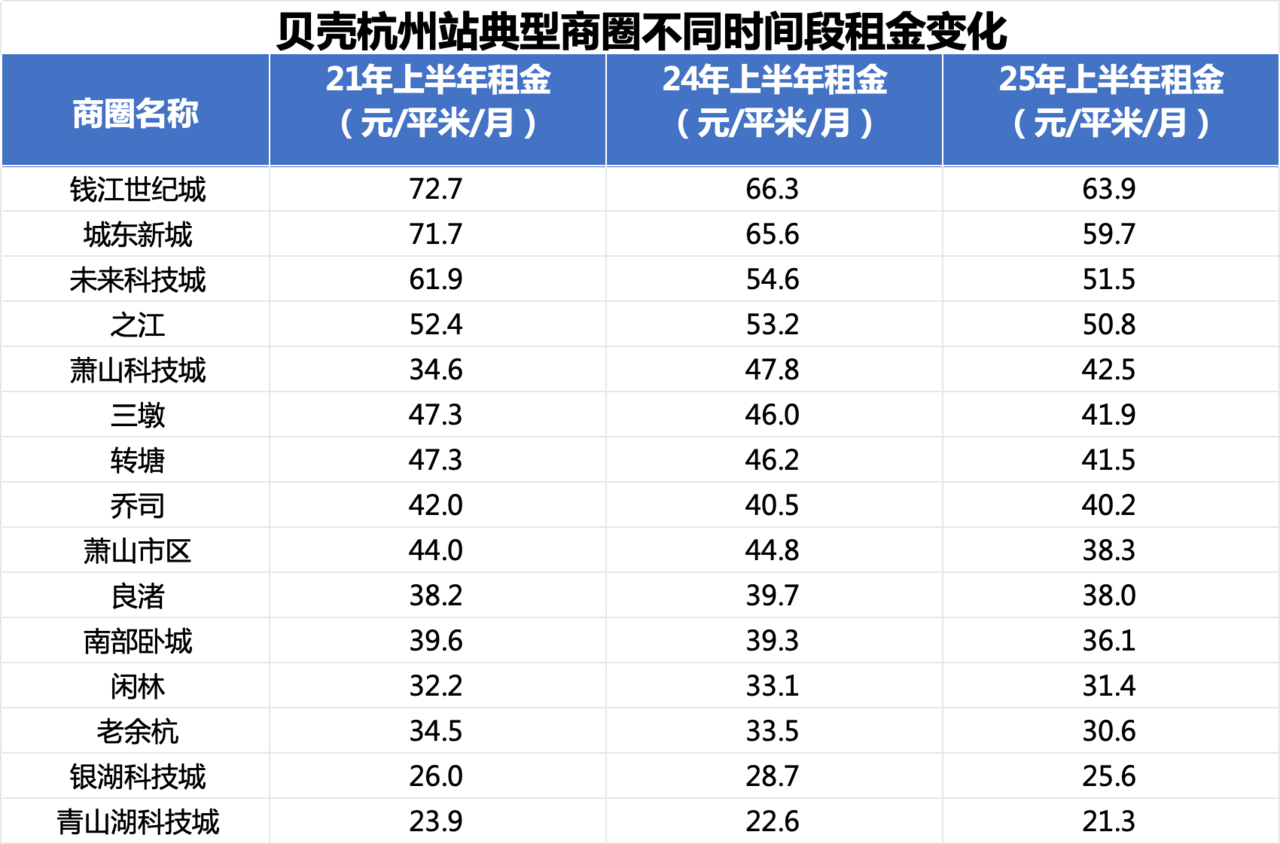 根据贝壳杭州站数据,2025年6月杭州最新市区租金为43.3 /㎡/月,相较21年6月最高点时下降18%,部分外围区域跌幅更明显,房源平均空置期达2个月。