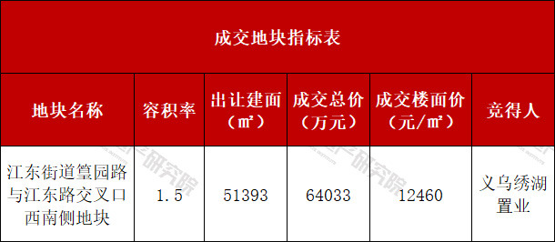 从成交结果来看,地块由义乌绣湖置业以64033万元总价竞得,折合成交楼面价12460元/㎡。