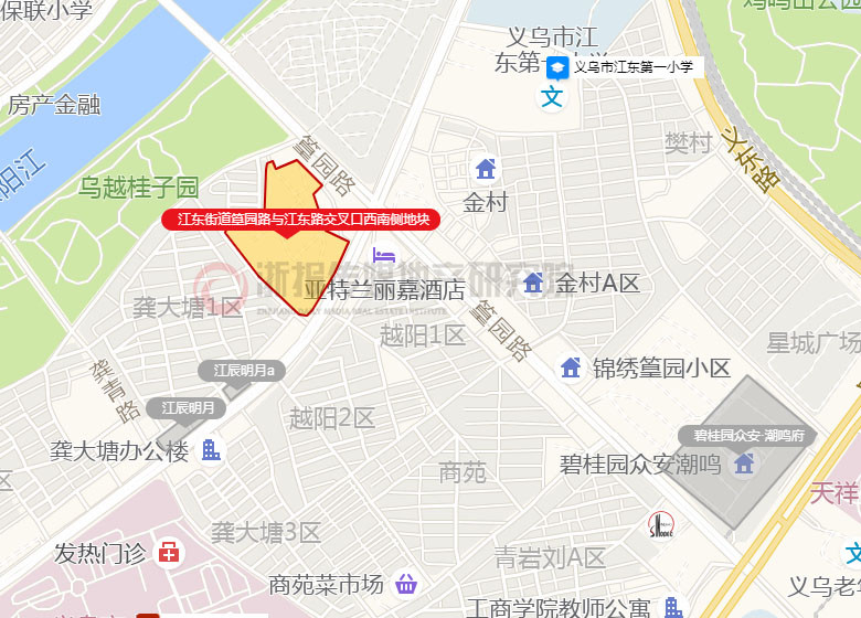 成交地块距离义乌天地直线距离不足1.5km,与绣湖商圈仅隔东阳江相望,完全在其商圈的辐射范围之内。