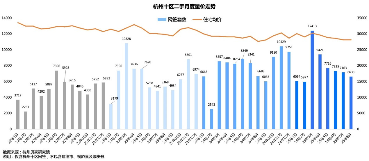 8月,杭州连续高温红色预警,但二手房市场淡季不淡。杭州贝壳研究院数据显示,市区(含富阳、临安)共成交二手房6633套,环比7月下滑7.4%;同比去年8月基本一致,微降0.88%。价格方面,住宅网签均价28178元/㎡,环比7月环比微涨0.2%,同比去年8月价格上涨2.0%。看似涨价的背后,与二手房成交结构有关,即局部改善板块成交回暖,使得整体均价微涨。实际上在市场中,以价换量仍是大多数。