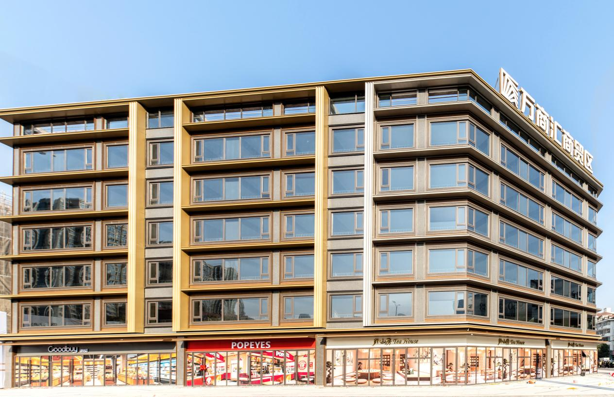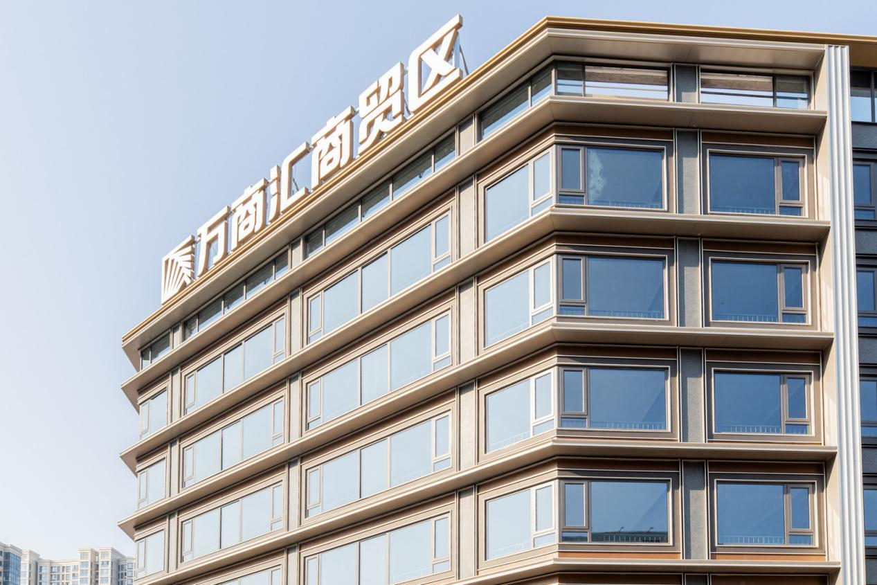建筑立面的“颜值经济学”。万商汇外立面的铝板线条并未采用常见的直角收边,而是定制了弧形铝型材。这一工艺虽增加了工艺难度与成本,却让建筑轮廓在光影下显得柔和而富有质感。显然,项目试图用更高的“颜值”吸引对形象有要求的品牌客户,为资产附加美学价值。