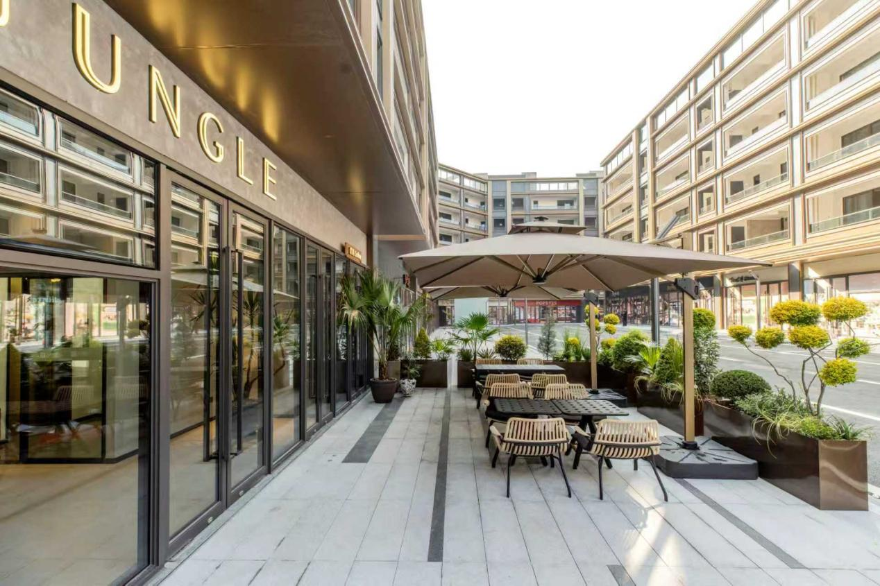走进示范区,首先引起注意的是一层的临街商铺的展示面与外部空间处理。这里打造成另一个咖啡空间,未来可作为重餐饮业态,非常宽敞,还预留了外摆区;在楼间距充足的前提下,为商户提供了延伸经营、聚集人气的可能,也呼应了义乌商业中对“门面”和“接地气”的双重重视。