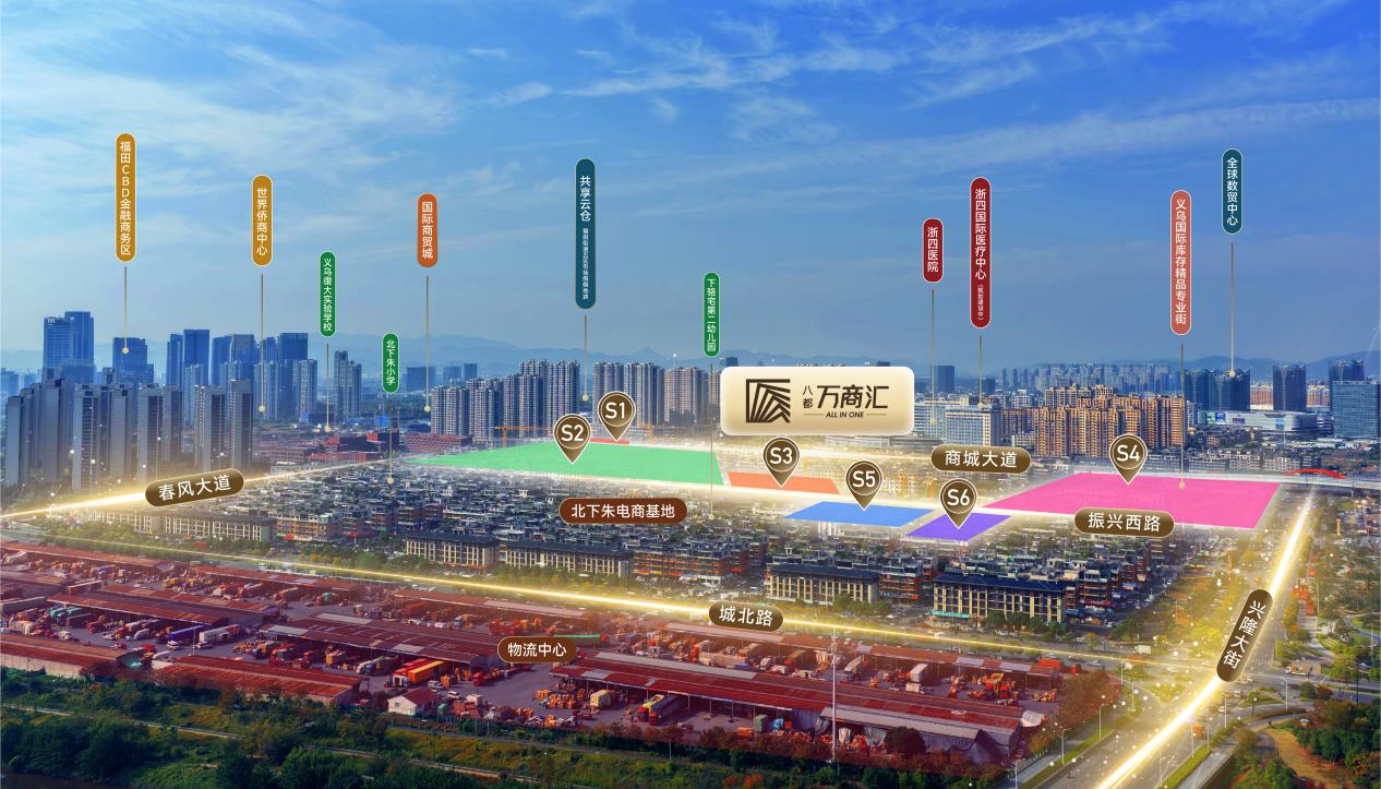 综合来看,八都·万商汇的核心竞争力,在于“绝版”区位的身位优势。项目1公里内涵盖全球数贸中心、福田CBD金融商务区、北下朱电商基地、国际商贸城、世界侨商中心5大商贸中心,如众星拱月般围绕在万商汇周边,日均25万全球商客往来,形成了“客流互导、消费互补”的自驱循环,这是义乌其他单体垂直楼无法比拟的地段优势。